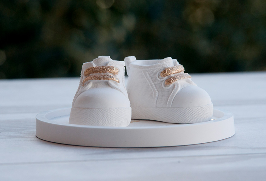 Δώρο μαιευτηρίου από υλικό με υφή χυτής πορσελάνης που περιλαμβάνει στρογγυλό πιατάκι και δύο μωρουδίστικα παπουτσάκια.
