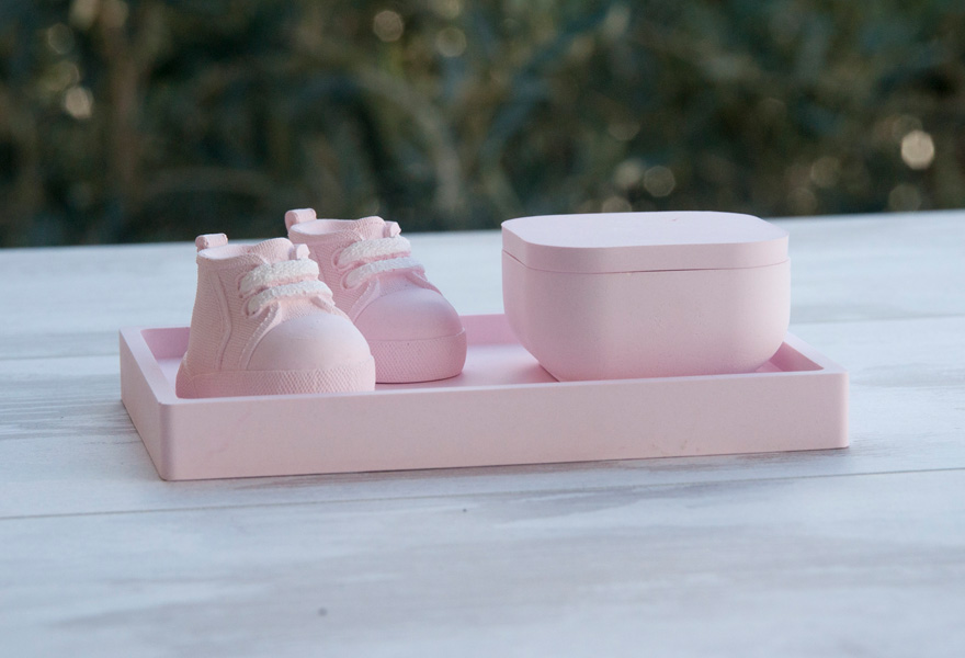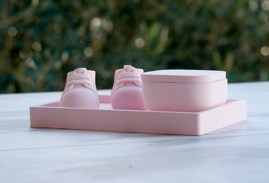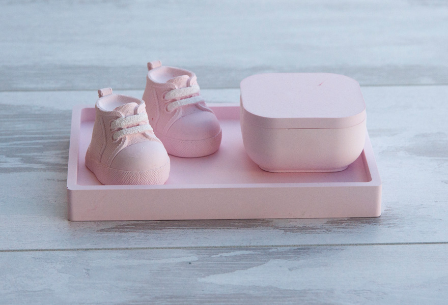 Δώρο μαιευτηρίου από υλικό με υφή χυτής πορσελάνης που περιλαμβάνει ένα πιατάκι παραλληλόγραμμο, δύο μωρουδίστικα παπουτσάκια και μια μπιζουτιέρα Dice.