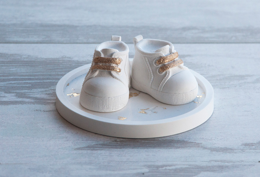 Δώρο μαιευτηρίου από υλικό με υφή χυτής πορσελάνης που περιλαμβάνει στρογγυλό πιατάκι και δύο μωρουδίστικα παπουτσάκια.