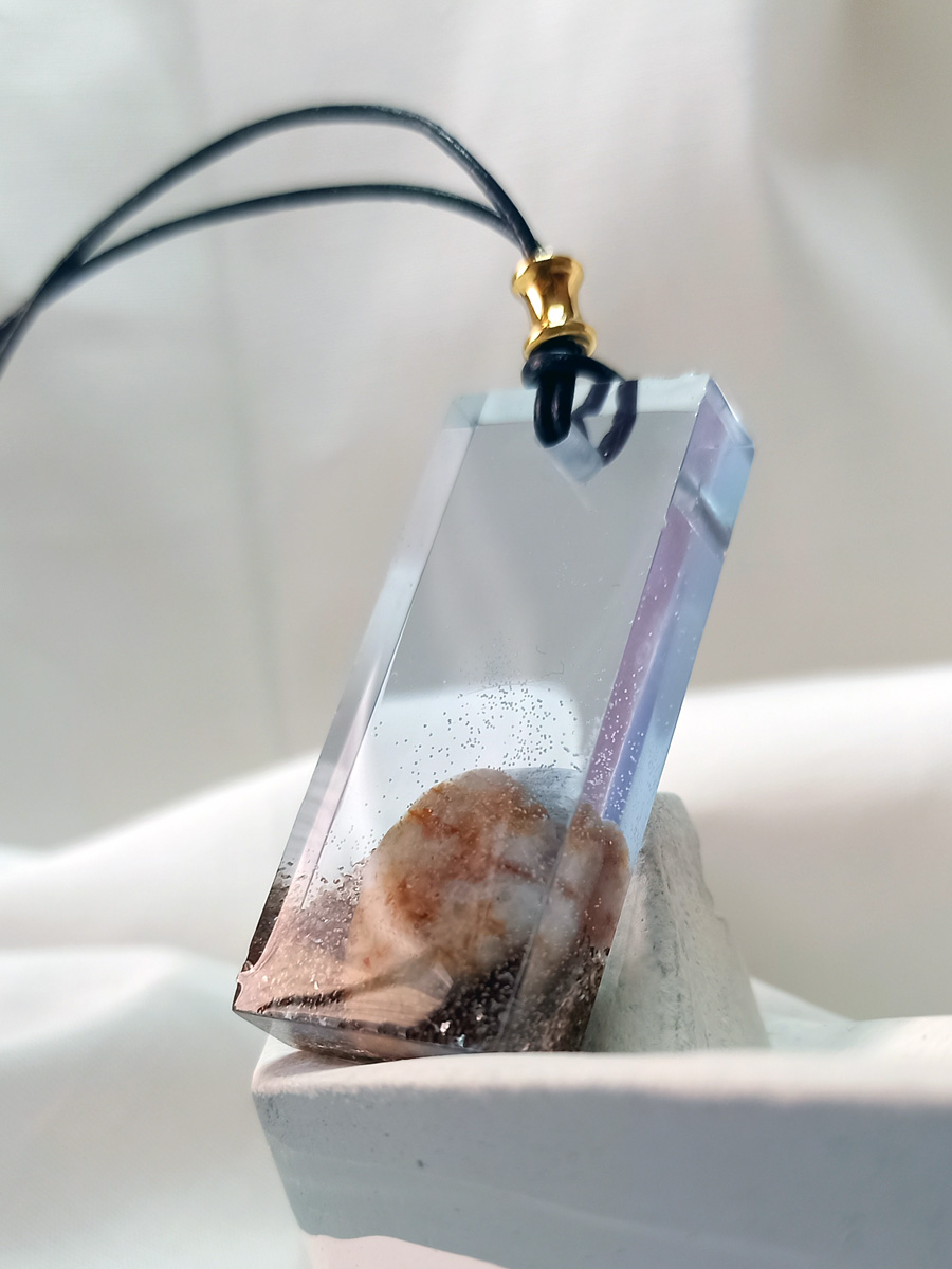 Χειροποίητο παραλληλόγραμμο κόσμημα, με κρυσταλλική άμμο και βότσαλο. Το δέσιμο είναι με δερμάτινο κορδόνι σε χρώμα μπλε σκούρο ή καφέ, με μεταλλικά στοιχεία χρυσά ή ασημί. Η συσκευασία είναι φάκελος από αλκαντάρα γκρι. Κάθε κόσμημα είναι μοναδικό και συνοδεύεται από serial number